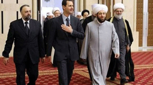 Syrian President Bashar al-Assad (C-R) arrives along with Grand Mufti Ahmed Hassun (C-L) a meeting with a group of various religious clerics from across Syria. (AFP)