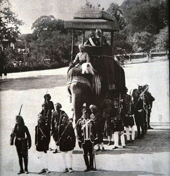 The Nizam's African troops walk beside him in a parade.
