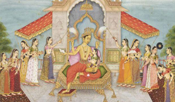 In a famous painting by Ruknuddin (below) dated 1678, Vishnu and Lakshmi are seen seated on a golden throne surrounded by eleven female attendants who minister to them. This is a polished work wherein the exquisitely-rendered folds of Vishnu’s robe, the fabrics of the assistants presenting gifts to the divine couple, and the subtle shading of the faces are reminiscent of Mughal paintings. This work is based on an important painting by Ali Reza.
