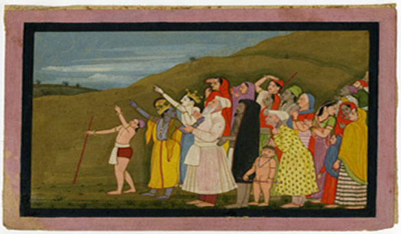 One of Ruknuddin’s sons, Shahibdin painted one of the finest Bikaner paintings—Krisna lifting Govardhana. In this painting, Krisna holds up Govardhana, providing shelter to the cowherds threatened by a cosmic downpour instigated by Indra. Semi-transparent clouds cover the mountain peaks. Indra on his elephant looks on. Shepherds and cowherds look in wonderment, while the cows graze.