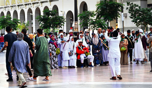traditionally dressed umrah visitors whose presence in Makkah and Madinah