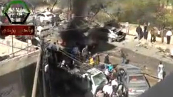 An image grab taken from a video uploaded on October 25, 2013 allegedly shows people gathering on the site of a car bomb attack outside a mosque in the town of Suq Wadi Barada, Damascus. (AFP)