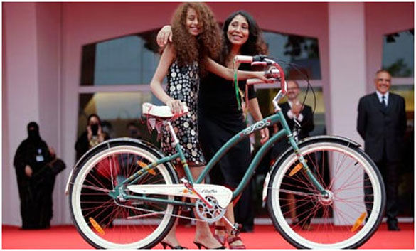 Saudi Arabian director Haifaa al-Mansour (right) and actress Waad Mohammed pose with a bicycle on the red carpet during the premiere of Wadjda during the 69th Venice Film Festival in 2012. Photograph: Max Rossi/Reuters