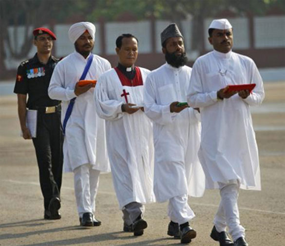 “All religions need introspection.” Picture shows a Hindu, a Muslim, a Christian and a Sikh carrying the holy books of their respective religions before giving the oath to newly inducted army personnel at a parade in Bengaluru.