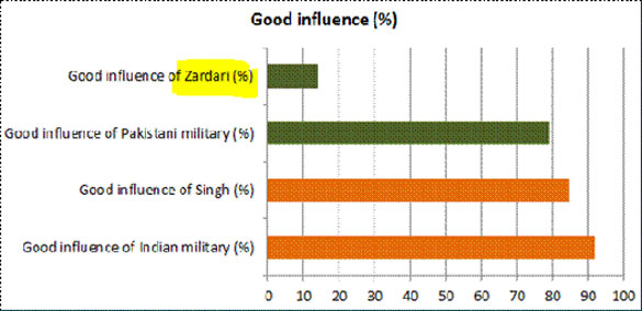 Despite Mr. Singh’s personal popularity with the electorate, the Indian National Congress, India’s ruling party, is fast crumbling as is evidenced by its dismal performance in the recent State elections in Uttar Pradesh. This makes the Zardari-Singh rendezvous a moot point. According to the below survey, Mr. Zardari’s party is about to lose an election. Whereas Mr. Singh’s party has just lost one.