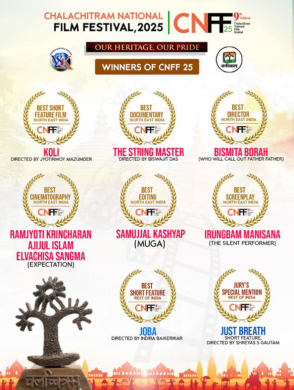 Scary loneliness of old ages while silently finding reasons to live and also gracefully depart the world, redefining the meaning of death, searching a peaceful home with closest ones, fraud and greed mesmerising the modern lives, an environment supporting the human race, socio-cultural heritages of Bharat enriched with thousands of years of legacy and many other striving issues came alive as 9th Chalachitram National Film Festival showcased over 30 short features and documentaries at Jyoti Chitraban premise in Kahilipara locality of Guwahati on 29 and 30 November 2025. Organized by Chalachitram, a subsidiary of Vishwa Samvad Kendra-Assam, the CNFF-25 screened the entries in both competitive and only screening categories, where ‘Koli’, directed by Jyotirmoy Mazumder, was adjudged as the best short film in north-eastern section, and ‘Joba’, directed by Indira Baikerikar, got the award for best short feature in the rest of India category.