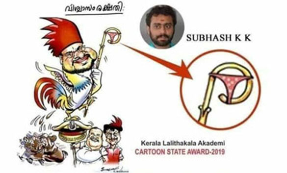 Actually the bishop was already in the news thanks to a cartoon that won the State Lalit Kala Akademi award. Following protests by the Catholic Bishops Council, the state government made some noises about making amends, but the Akademi tried to stand its ground. The cartoon by Subash showed Bishop Franco as a rooster in brilliant colours, holding the ceremonial bishop’s staff on the crown of which hangs a woman’s underwear. The rooster is standing on a police cap held up by two politicians, a party-hopping opportunist and a communist leader caught in a sex scandal of his own, with a bunch of nuns fleeing from the scene.