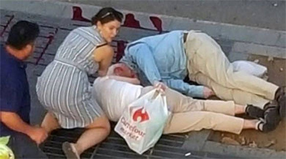 barcelona, terror attack, barcelona van, islamic state barcelona, isis barcelona La Rambla, Barcelona terror attack: Injured people are treated in Barcelona, Spain, Thursday, Aug. 17, 2017 after a white van jumped the sidewalk in the historic Las Ramblas district, crashing into a summer crowd of residents and tourists and injuring several people, police said. (AP Photo)