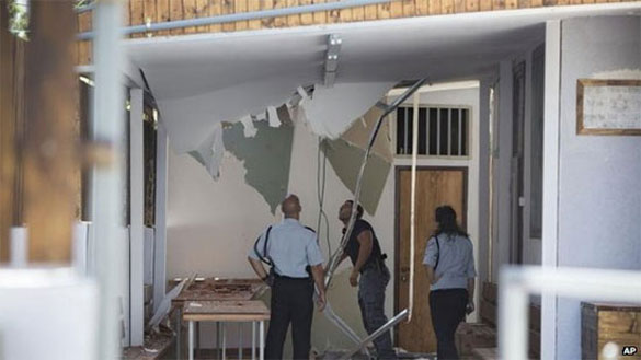 Israeli police check damage from a rocket attack on a synagogue in Tel Aviv