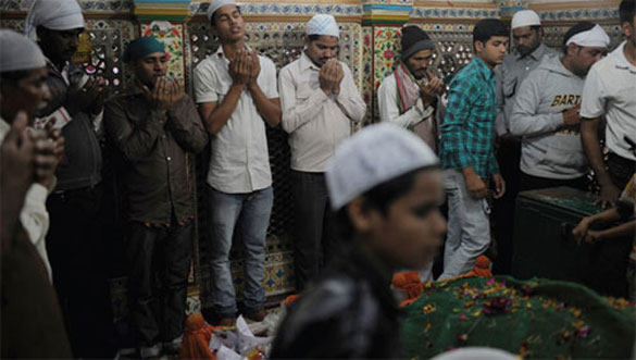 Men pray inside the Nizamuddin Dargah. Photo: AFP