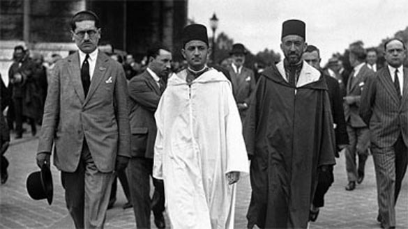 File: Morocco's Mohammed V, wearing white robes, walking with the country's Grand Vizier Si Mohammed El Mokri after he placed a wreath on the Tomb of the Unknown Warrior at the Arc De Triomphe during a visit to Paris, France around July 4, 1930. (AP Photo)