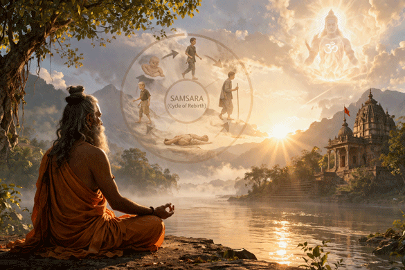 According to Hindu philosophy, a person is born again and again in different forms. This cycle continues based on one’s actions, known as karma. Good and bad deeds decide the next life. However, when a person achieves spiritual perfection, controls desires, and gains true knowledge, they attain Moksha. In this state, the soul unites with God and becomes free from worldly suffering forever.