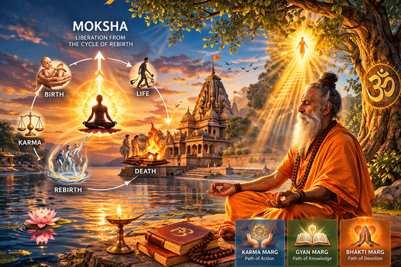 Moksha means freedom from the cycle of rebirth (Samsara). Every Hindu hopes that one day this cycle will end, and they will not be born again. This happens only when a person becomes free from all karma, both good and bad, so that no new birth is required.