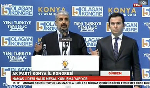 Hamas leader Khaled Mashaal addresses the AKP regional party congress in Konya, Turkey, on December 27, 2014.