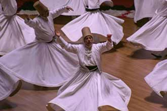 The whirling dervishes prepare for the Sema ceremony. The headdress represents the ego's tombstone, the white skirt the ego's shroud.
