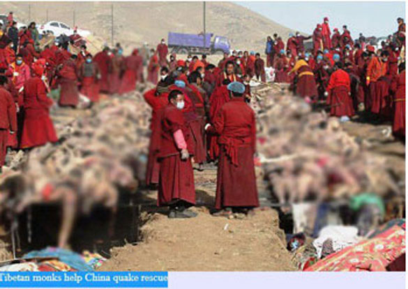 Except that the picture is actually two years old, and shows the corpses of the Tibetan victims of the terrible earthquake of 2010 as they were being arranged by Buddhist monks into a massive pyre for proper cremation. [Also see this by scrolling down on this page]