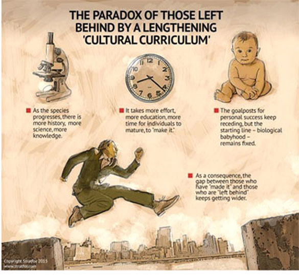 In the modern world, the development of the individual human, which is tied in part to culture, has become more and more important. If you think of a single human life as a kind of footrace — as if the developmental path from infancy to maturity were spanning a certain distance — then progress over the last several millennia has moved out the goal posts of maturity. It simply takes longer to learn the skills it takes to "make it" as an adult. Surely there were skills our Stone Age ancestors had to acquire that we moderns lack, but they did not have to file income taxes or shop for insurance. Postmodern thinkers have critiqued the idea of progress and perhaps we do need a concept that is forgivingly pluralistic. Still, there have been indisputable improvements in many basic measures of human progress. This is borne out by improved demographic statistics such as birth weight, height and longevity, as well as declining poverty and illiteracy. To put it very simply, we humans have come a long way.