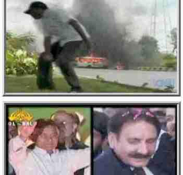 A montage of three different but related events that were taking place on May 12, 2007. On top an APMSO activist in Karachi throws a stone at a pro-CJP rally as a bus burns in the background; on bottom left, former military ruler General Musharraf waves to a ‘hired’ crowd at a rally in Islamabad; and on bottom right, Chief Justice Iftikhar Chaudhry (who was fired by Musharraf on corruption charges), arrives at the Karachi airport. The violence in the city forced him to return to Islamabad.