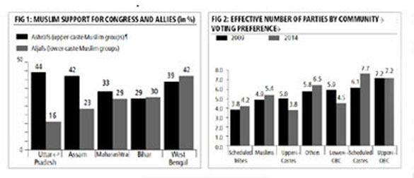 The Congress party that has governed India for most of its post-Independence history has relied upon the support of Muslim elites (and not those who are economically downtrodden). The National Election Study (NES) 2009 by Lokniti-CSDS suggests that in states with sizeable Muslim populations, the Congress’s support is largely upper-caste Muslim communities (Figure 1). In Uttar Pradesh and Assam, where the party contested the 2009 elections alone, its support among upper-caste Muslims was approximately twice that among lower-caste Muslims. In states where the Congress had a pre-poll alliance, such as with the RJD in Bihar and the TMC in West Bengal, it drew less votes from upper-caste Muslims.