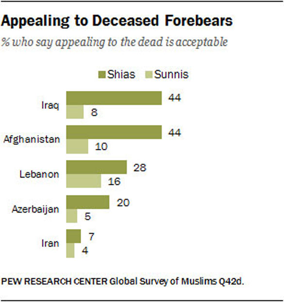 In all five countries, fewer than half of both Shia and Sunni Muslims say that Islam permits appealing to dead relatives or ancestors for aid. However, Shias are significantly more likely than Sunnis to accept this practice. The gaps are largest in Iraq (+36) and Afghanistan (+34), while significant differences are also found in Azerbaijan (+15) and Lebanon (+12). Only in Iran is there virtually no difference in Shia and Sunni attitudes toward appealing to deceased relatives or forebears.