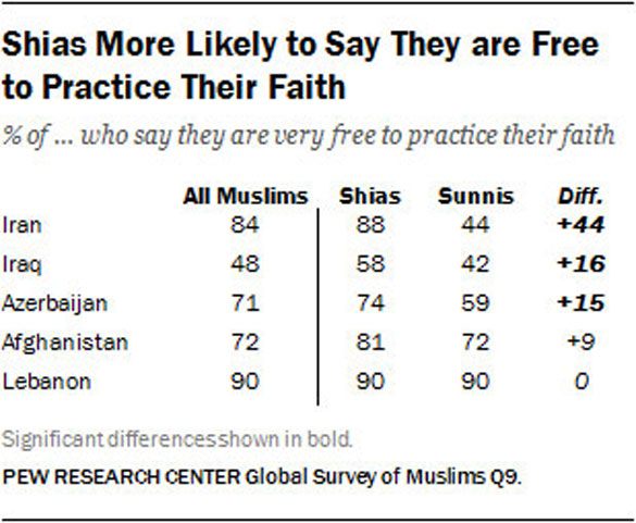 In four of the five countries where substantial numbers of Shias and Sunnis were surveyed, most Muslims say they are very free to practice their faith. But only about half (48%) of all Muslims in Iraq – including 58% of Iraqi Shias and 42% of Iraqi Sunnis – describe themselves as very free to practice their religion.
