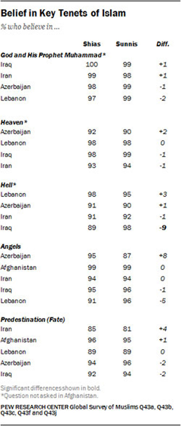 Belief in angels and predestination represent two other central articles of faith in Islam. In the five countries surveyed, overwhelming majorities of Shias and Sunnis say they believe in angels and predestination. There are not significant differences by sect in attitudes toward these core tenets of Islam in any of the five countries surveyed.