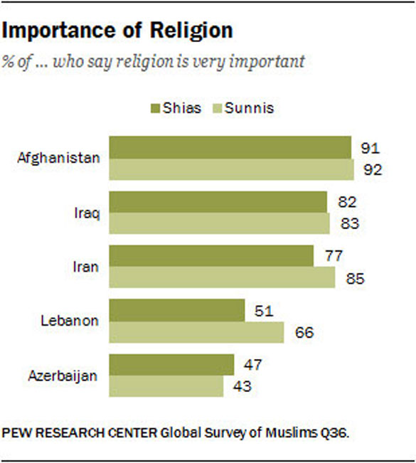 In Afghanistan, Iraq and Iran, for example, at least three-quarters of Shias and Sunnis say religion is very important to them, with no significant differences between the sects. In Azerbaijan, too, Shias and Sunnis share a similar view of religion, with just under half in each group (47% and 43%, respectively) saying religion is very important in their lives. Only in Lebanon do the two sects differ significantly over the importance of religion: 66% of Lebanese Sunnis say religion is very important, compared with 51% of Lebanese Shias.