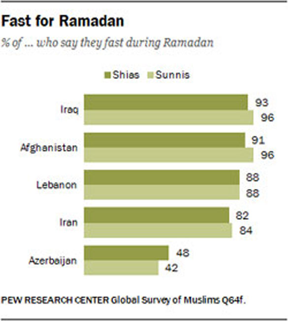 When it comes to fasting during the holy month of Ramadan – a central pillar of Islam – there is, again, substantial variation between countries but little discernible difference between Shias and Sunnis within each country. In Iraq, Afghanistan, Lebanon and Iran, for instance, more than eight-in-ten members of both sects say they fast during Ramadan. In Azerbaijan, by contrast, fewer than half of either Shias (48%) or Sunnis (42%) report that they observe the traditional fast during daylight hours throughout the month. In none of the countries surveyed are either Shia or Sunni Muslims significantly more observant of the Ramadan fast.