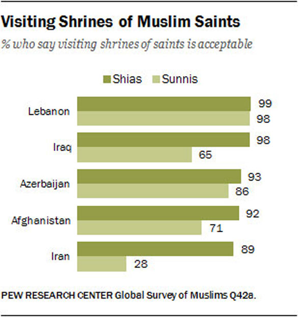 By contrast, the gap in Shia and Sunni attitudes is smaller in Azerbaijan (+7 percentage points) and nearly nonexistent in Lebanon, where both Shia and Sunni Muslims nearly universally say pilgrimages to the tombs of Muslim saints are acceptable.