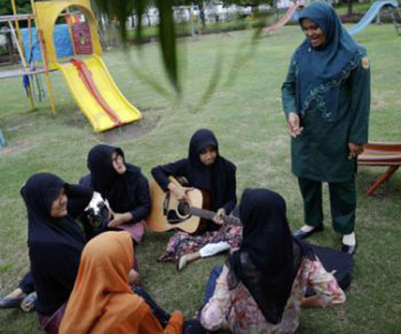 A member of the Sharia police force known as Wilayatul Hisbah insists on inspecting the clothes of girls relaxing in a park in Indonesia's Banda Aceh, in December 2012. Sharia police personnel patrol parks and beaches every day looking for unmarried couples, Muslim women without headscarves or those wearing tight clothes, and people drinking alcohol or gambling.