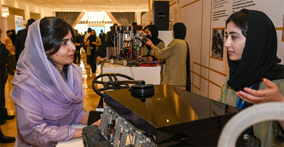 talking to member of Afghan Girls Robotics Team Florance Pouya (R) at the Doha