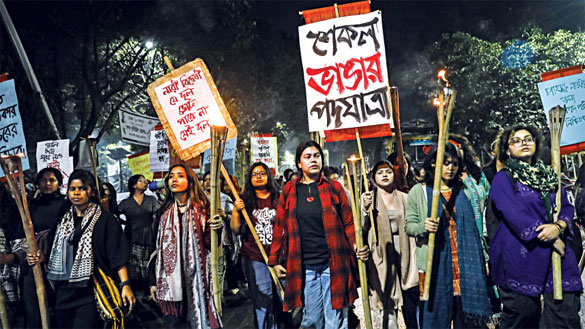 Women from all walks of life, including activists, students, and job holders, took part in the fifth edition of the ‘Shekol Bhangar Jatra’ (March to Break the Shackles) last night, marching from Shahbagh to Kalabagan via Manik Mia Avenue to protest what they described as misogynistic politics and hate speech. The photo was taken in the capital’s Dhanmondi at 1:09am. PHOTO: ORCHID CHAKMA