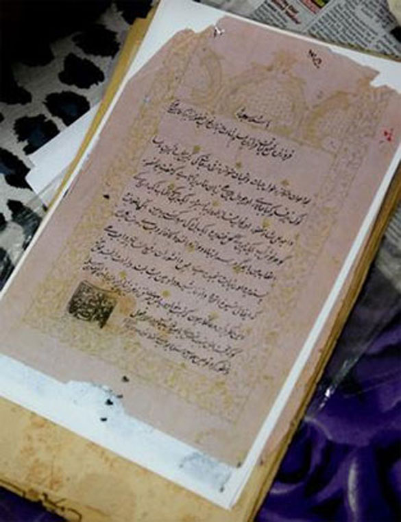 The Hindu Photo: Collector of old documents, Khalid Sabir, showing Nikah Nama of Wajid Ali Shah's son at his residence in New Delhi on September 01, 2014. Photo: S. Subramanium