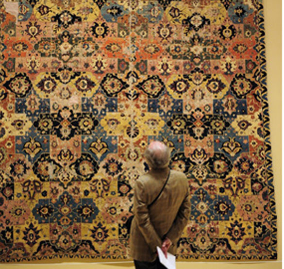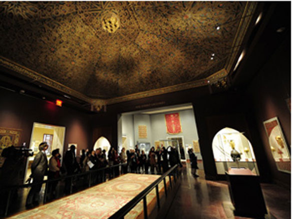 Highlights of the Museum’s collection include: the sumptuously ornamented Damascus Room, built in A.H.1119/ 1707 A.D. and one of the finest examples of Syrian Ottoman reception rooms from the house of an important and affluent family; glass, metalwork, and ceramics from Egypt, Syria, Iraq, and Iran; some of the finest classical carpets in existence from the 16th and 17th centuries, including the recently restored, celebrated Emperor’s Carpet, an exceptional classical Persian carpet of the 16th century that was presented to Hapsburg Emperor Leopold I by Peter the Great of Russia; notable early and medieval Qur’ans; pages from the sumptuous copy of the Shahnama, or Book of Kings, created for Shah Tahmasp (1514–76) of Iran, and outstanding royal miniatures from the courts of the Arab World, Ottoman Turkey, Persia, and Mughal India, including paintings from the imperial “Shah Jahan Album,” compiled for the builder of the Taj Mahal; and architectural elements including a 14th-century mihrab, or prayer niche, from Isfahan decorated with glazed ceramic tiles, which would have served in a Muslim house of worship to indicate the direction to Mecca.