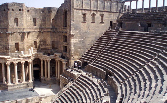 Far to the south, the 2nd Century Roman amphitheatre of Bosra, once the capital of the Roman Province of Arabia, is concealed within a 13th Century fort not far from the Jordanian border. It has been occupied during the current fighting by army snipers and shabiha militia, its windows piled with sandbags, firing at rebel pockets in the Old Town of Bosra.