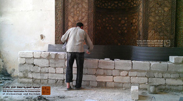 This protective wall is being built in front of the 13th Century Halawiye Madrassa prayer niche in Aleppo.
