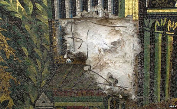 The mosaics depict visions of Paradise with fantastical buildings surrounded by trees and gardens - the Syrian authorities have since repaired the damage.