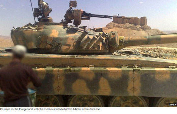 Syrian armed forces are also installed in the medieval Arab citadel of Ibn Ma'an overlooking the site (see photograph with tank above). Shells fired from this natural vantage point damage not only the ancient site, but also ancient olive, date and pomegranate plantations, destroying the livelihood of many local people.