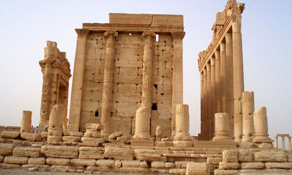 Shells have hit the columns of the ancient city's Temple of Bel (seen above before the bombardment), causing two of them to collapse.