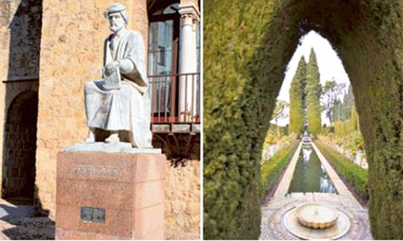 The statue of Ibn Rushd in Cordova, left, and Genera life gardens in Granada