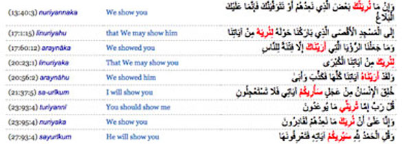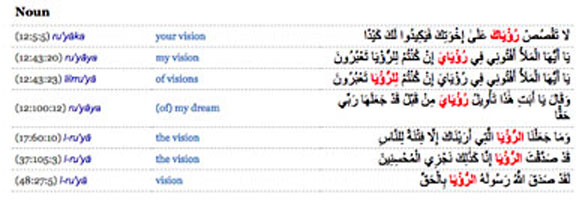Curiously, another term used in Q17:60 is what is translated as vision or dream. The words translated as show and vision in Q17:1 and Q17:60 share the same root in Arabic. The following screenshots give an idea their usage in some other ayaat of The Quran as well: