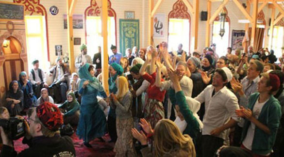 The audience sits on chairs or cross-legged on the floor in front of the stage. A few dozen of them sway along to the music in a somewhat restrained manner. The men are wearing simple woollen robes and turbans wrapped around a pointed hat. At that moment, Sheikh Hassan Dyck enters the room. The director of the lodge is wearing a turban as white as his long beard. He takes in the gathering through circular spectacles.