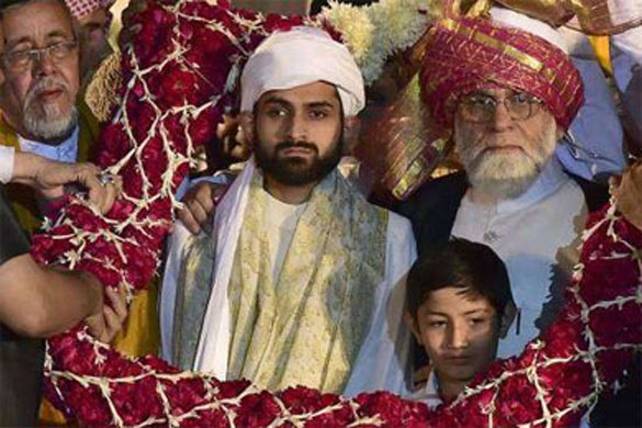 Shaban Bukhari (C), the son of Delhi's Jama Masjid Shahi Imam Syed Ahmed Bukhari (R) after being formally anointed the Naib Imam of the 17th century mosque at a ceremony in New Delhi.