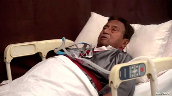 FILE - Pervez Musharraf, Pakistan's former military leader, is seen in a hospital bed in Dubai, United Arab Emirates, Dec. 18, 2019, in a still image taken from video. (All Pakistan Muslim League handout via Reuters)