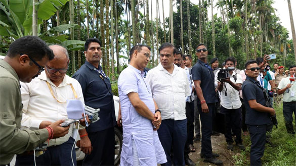 In this image released by CMO Assam on July 25, 2025, Assam Chief Minister Himanta Biswa Sarma with others during an inspection of sites for eviction drives at Uriamghat, in Golaghat district, Assam. Photo Credit: Assam CMO