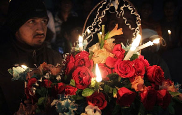 Activists of a religious group's student wing hold a flower basket and candles. — AP