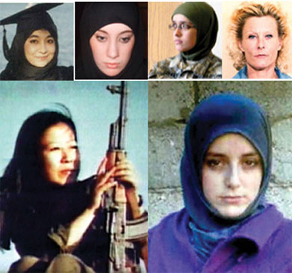 Clockwise from above: Dr Aafia Siddiqui, Pakistan-born neuroscientist imprisoned in Texas for planning a dirty bomb attack; Samantha Lewthwaite, now in Syria, known as the White Widow is one of the most wanted Islamist terrorists; 19-year-old Shannon Conley who was arrested for aiding IS fighters in Syria; Colleen La Rose alias Jihad Jane was convicted in 2010 for plotting to murder Swedish cartoonist Lars Vilks for “insulting Islam”; Chechnyan ‘Black Widow’ Madina Alieva who blew herself up killing Russian soldiers; Fusako Shifenobu, the world’s most wanted female terrorist reportedly living as a recluse in Syria