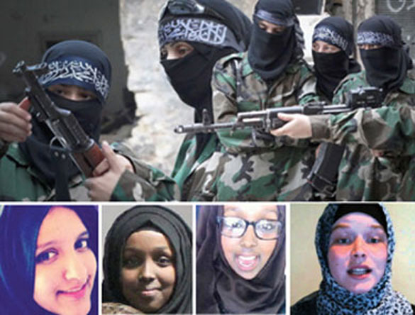 Clockwise from above: Camouflaged women jihadists; Nicole Lynn Mansfield, the first American jihadi woman to die in the Syrian war; Zahra Halane and Salma, Somali-British women who have gone to Syria to join IS; 20-year-old Aqsa Mahmood, head of the Syrian insurgent al-Khanssaa brigade which functions as religious police force to punish women for “un-Islamic behaviour”