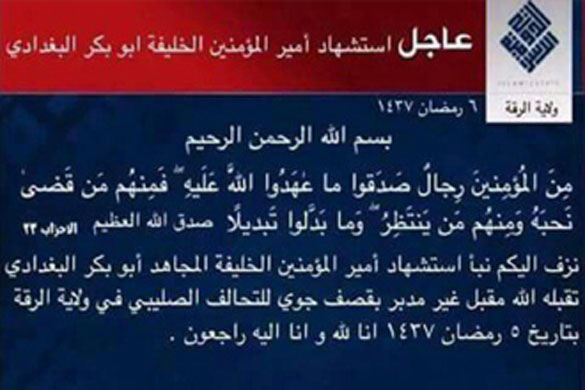 Though the US government has not yet confirmed, media reports say that the self-declared Caliph of the so-called Islamic State Abu Bakr Baghdadi has been killed in an air raid in Syria by the US-led coalition. Most notably, the ISIS has released a poster in Arabic in which it has glorified the ‘martyrdom’ [istishad] of al-Baghdadi as al-khalifah al-mujahid (great fighter and caliph) and ameerulmu’mineen (chief of the believers).The ISIS has commemorated the ‘sad demise’ of its chief quoting a verse from the Qur’an that reads: