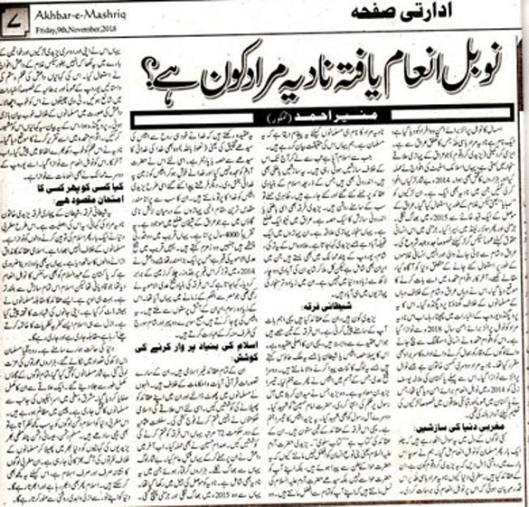 Actually, the story of Nadia has put the atrocities of the ISIS against non-Muslims of Syria and Iraq and the conferment of Nobel Peace Prize on her has made ISIS sympathizers restless. Therefore, Munir Ahmad could not hide his love for the terrorists who in his view were the members of the caliphate.